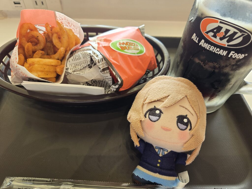 近くのA&Wでモッツァバーガーのセットを食べる